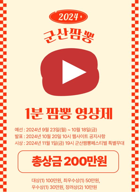 2024군산짬뽕페스티벌을 맞아 모든 사람들이 군산짬뽕을 알고 재미있게 즐길 수 있도록 하기 위한 “군산짬뽕 1분영상제”을 다음과 같이 개최하니 많은 응모바랍니다.